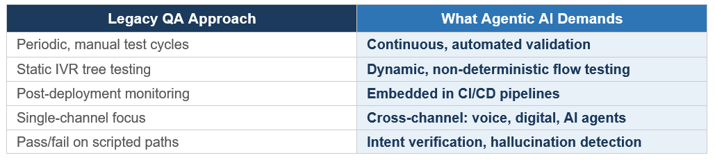 A misconfigured IVR menu is an inconvenience. An autonomous agent that hallucinates account information, routes calls into dead ends, or violates compliance policies at scale is a brand-damaging, revenue-losing, regulatory event.